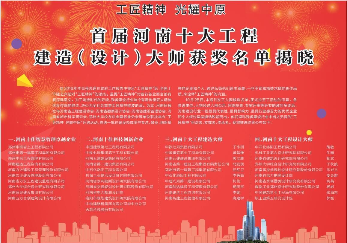 據(jù)河南日報(bào)1月4日消息,“工匠精神 光耀中原”首屆河南省十大工程建造(設(shè)計(jì))大師獲獎(jiǎng)名單揭曉,我公司獲得“河南十佳科技創(chuàng)新企業(yè)”,牛飚同志獲得“河南十大工程設(shè)計(jì)大師”。